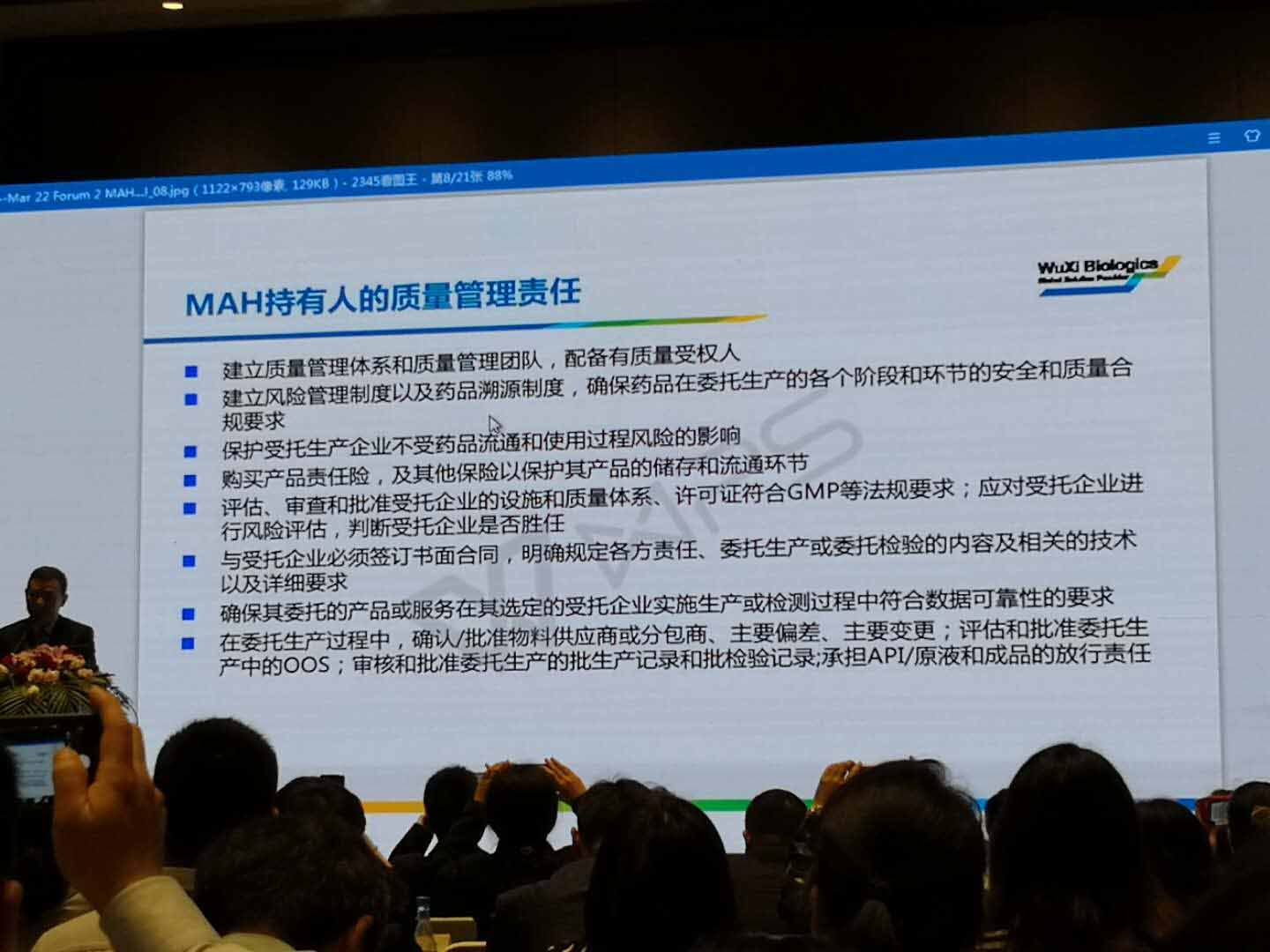 22日下午1時,藥品MAH試點主題論壇如期舉行,與會者濟濟一堂,首先聽取了江蘇省藥品監(jiān)督管理局藥品注冊處處長關(guān)于MAH制度管理解讀,對持有人法律責任、MAH委托生產(chǎn)管理、委托銷售管理、臨床ADR監(jiān)測、MAH保險救濟等方面內(nèi)容有了深入的了解。接著,藥明生物等知名藥企代表更從實踐的角度詳細介紹MAH的落地,可以說受益匪淺。